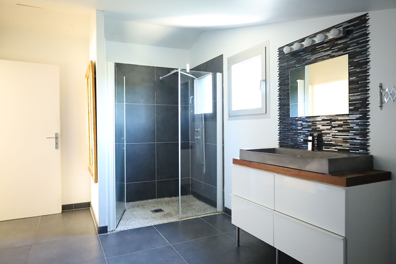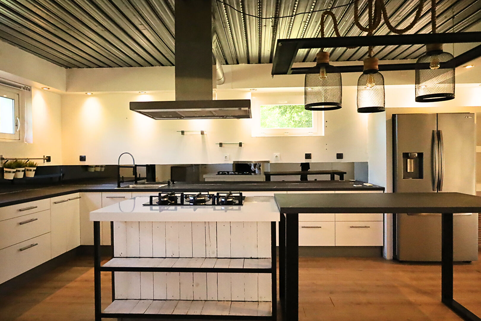 L’entrée ouvre sur une somptueuse pièce de vie de 75 m², véritable coeur de la maison. La lumière y circule librement, sublimant la décoration industrielle et les matériaux bruts. La cuisine entièrement équipée s’intègre parfaitement à cet espace ouvert, idéal pour recevoir et partager. Ce niveau donne également accès à une cave pratique ainsi qu’à une terrasse couverte qui surplombe la piscine. Cette maison dispose au niveau de l’entrée d’un espace dressing, d’un cellier et d’un garage accessible par une allée goudronnée. L’ensemble offre un lieu de vie exceptionnel, à la fois convivial, chaleureux et visuellement remarquable.
