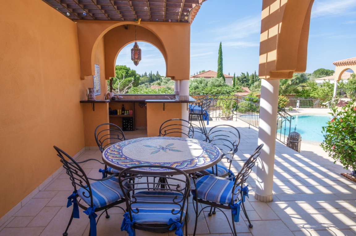 Sure les hauteurs de La Palme. Découvrez cette maison d’exception, nichée dans un cadre privilégié, offrant 300 m² d’élégance et de confort. Avec ses volumes généreux et ses prestations haut de gamme, cette propriété vous séduira par son alliance parfaite entre luxe, modernité et vue panoramique sur la mer et l’étang de la Palme. Dès l’entrée, vous serez accueilli dans une pièce de vie spacieuse et baignée de lumière. Grâce à ses larges baies vitrées, la maison s’ouvre entièrement sur l’extérieur, permettant de profiter pleinement de la luminosité naturelle et des vues à couper le souffle. Ce lieu de vie central est un espace où chaque détail a été pensé pour offrir confort et convivialité, parfait pour recevoir en toute élégance. La maison comprend six chambres élégantes, dont certaines avec une vue dégagée, idéales pour accueillir famille et invités dans un cadre apaisant. Les matériaux et finitions haut de gamme soulignent le caractère unique de chaque pièce. A l’extérieur, un véritable havre de paix vous attend : une piscine magnifique surplombant l’horizon, offrant des moments de détente privilégiés face aux paysages environnants. La terrasse ensoleillée avec son pool-house et les espaces verts viennent parfaire ce cadre enchanteur, idéal pour profiter des belles journées sous le ciel méditerranéen. (4.03 % honoraires TTC à la charge de l’acquéreur.)